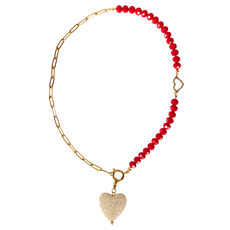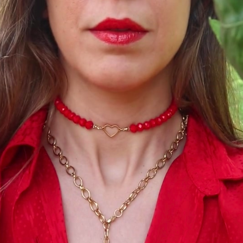 Especialmente para San Valentín, el Collar Loveme mezcla cristales rojos llenos de energía y una cadena dorada que lo hace brillar. Un corazón une ambos mundos, mientras que el cierre lo convierte en algo más que un accesorio. Dependiendo de cómo lo pongas, puedes usarlo como choker o darle tu toque único, añadiendo los charms que te definan.