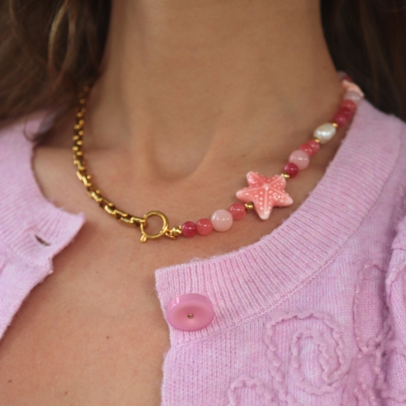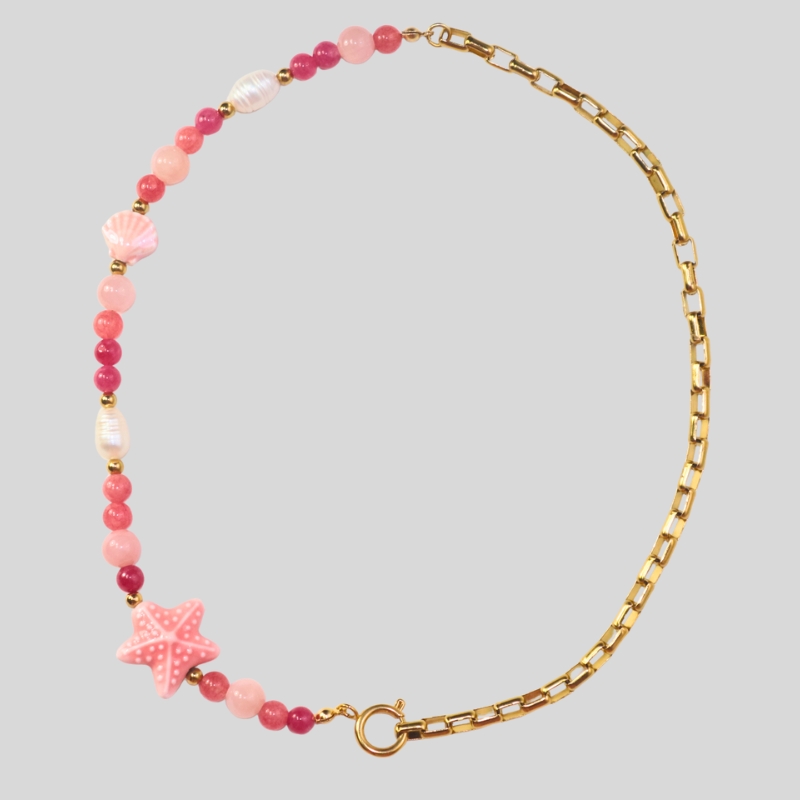El collar Marela combina cadena de acero inoxidable ( cadena más fina que la de los otros colores) y piezas únicas para crear una joya versátil. La mitad del collar es cadena resistente, mientras que la otra mitad está formada por un mix de piezas de cerámica en forma de estrella más conchas, y también perlas y piedras naturales, aportando un detalle especial a tu look.